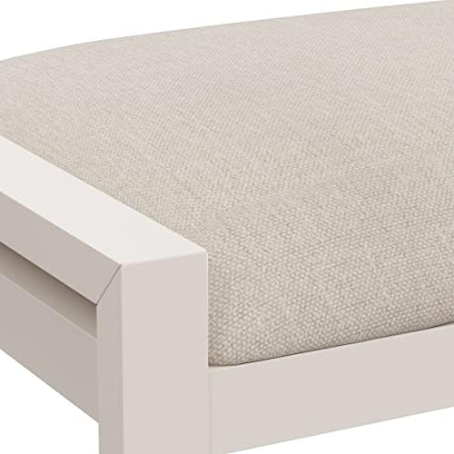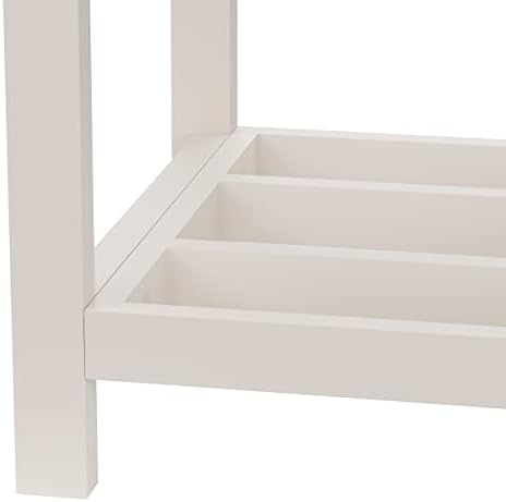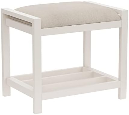 You’ve got to be feeling the casual vibes with this Upholstered Vanity Stool. You’ll add transitional charm to your vanity set, bathroom, or wherever an accent stool is needed. The white solid wood frame provides a clean and casual look, offset by gently textured, light beige linen fabric. Steal some extra storage with the mission-style shelf that fits baskets or stacked items. Whether you use it to rest your backside or prop up your tired feet, the firm, upholstered vanity seat offers trustworthy support. Assembly required.