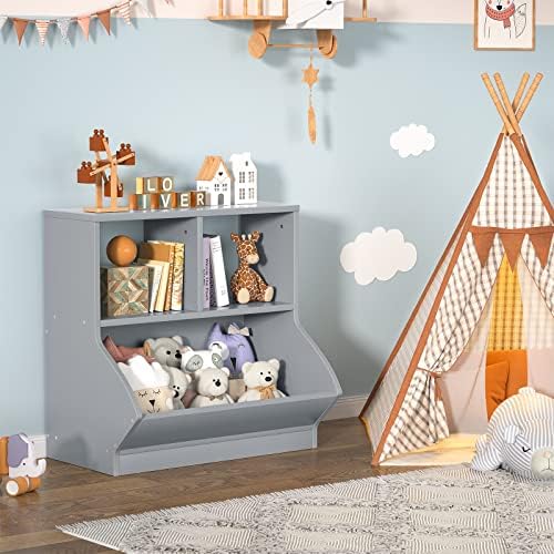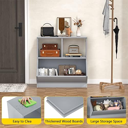 【Sturdy Grey Bookshelf】: The Toy Storage bins is make of high-quality P2 MDF Board provides great stability and durability. Simple Gray Painted Finish is suitable for different decor styles and help to easily store toys, books, and thus save organizing time.