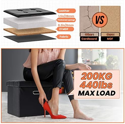 COSYLAND Ottoman with Storage Folding Leather Ottoman Footrest Foot Stool Black Ottoman for Room Small Rectangle Collapsible Bench Furniture with Handles Lid Toy Chest 17x13x13in