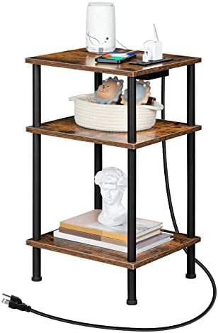 HOOBRO Set of 2 Side Tables with Charging Station and USB Ports, 3-Layer Stackable Nightstand, 23.2 Inches End Table for Small Space in Bedroom, Living Room, Industrial Style, Rustic Brown BF10UBZP201