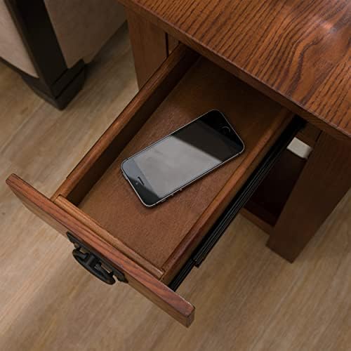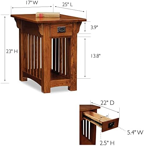 Alongside seating, this sleek mission design pays dividends by giving you arms length convenience in a very small space. Blackened ironware drawer pull hardware, slatted elements, and overhanging tops make this the ultimate mission end table. Rich wood grain adorns this traditionally styled table. Ball bearing drawer guides extend fully to reveal the solid wood drawer. The Mission Impeccable table collection features include a single drawer for the things you don’t want to see and a lower display shelf for the things you do.