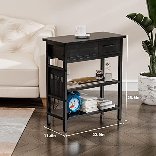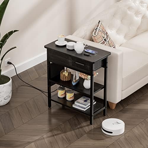 MASHOOPS End Table with USB Ports and Outlets, Narrow Sofa Side Table with Fabric Bags Drawer and Shelf, Slim Nightstand Flip Top for Small Space Bedroom or Living Room (Black)