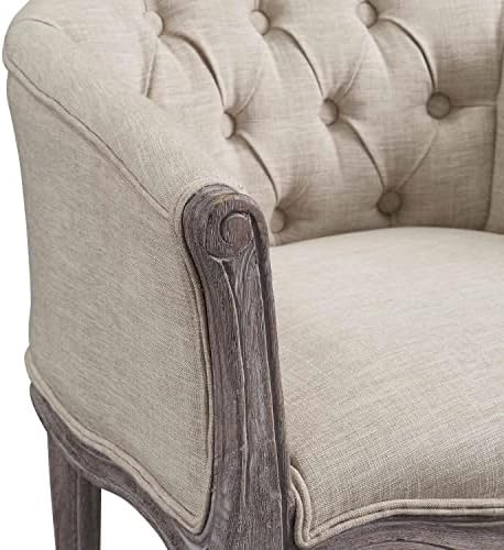 Revel in the whispered opulence of the Crown Dining Armchair. Featuring a fluted wood frame with elegant cabriole legs, dense foam upholstered fabric seat and backrest with welting and button tufting, this round barrel back dining or accent chair harmoniously blends old world charm with modern intrigue. Designed with a weathered vintage French look and an undeniable appeal, Crown supports up to 331 pounds and comes with foot pads to preserve flooring. Comes fully assembled.