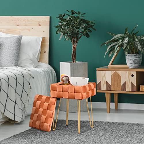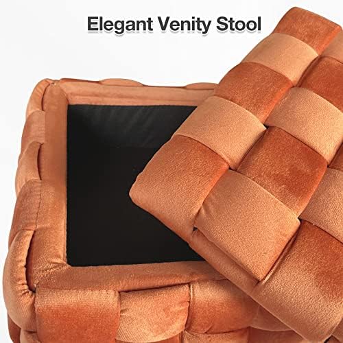 MOOWIND Vanity Stool Footrest Storage Ottoman Woven, Modern Velvet Vanity Seat Chair Dressing Stool Footstool Square Upholstered for Makeup Room Living Room with Gold Metal Leg,Pumpkin Orange