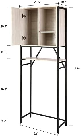 Stable Frame& Sturdy Construction: Dimension: 60cm L*26cm W*169cm H. Over the toilet storage cabinet with the anti-tilt device, and structural design is practical, sturdy and stable. Wooden board with metal frame ensures the stability and durability of the over toilet shelf. The toilet shelf with a mirror is beautiful and convenient.