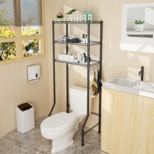 Over the Toilet Storage, FUTASSI 3 Tier Metal Free-standing Bathroom Organizer Storage with Adjustable Shelves, Stable Organization Shelf Rack Space Saver with 4 Hooks, 64″H x 25.5″L x 13.7″W, Black