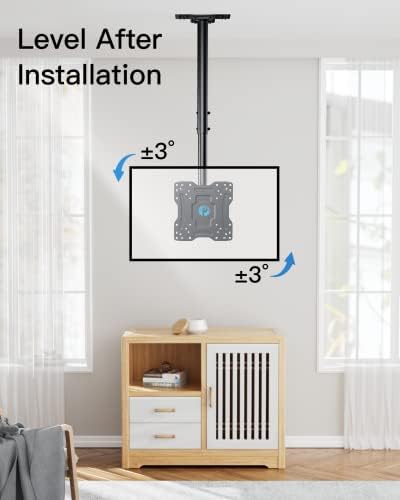 OPTIMIZED VIEWING ANGLE: The full motion TV ceiling mount bracket features 5° tilt up and 15° tilt down to minimize glare, 360° swivel to enjoy TV from anywhere in the room, and +/-3° leveling after installation.