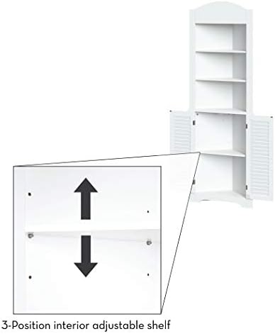 Convenient corner design with two door shutter styling in a tall cupboard. includes three open shelves on top for additional storage or display space and one shelf in the bottom cabinet. MDF Wood Composite. White painted finish. Easy assembly. 23.25 in. W x 11.5 in. D x 68.31 in. H