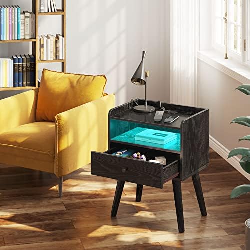 Rolanstar Nightstand with Charging Station and LED Lights, Mid Century Modern End Table with Sliding Drawer and Storage Shelf for Living Room, Bed Side Table for Bedroom – Black
