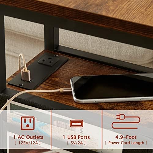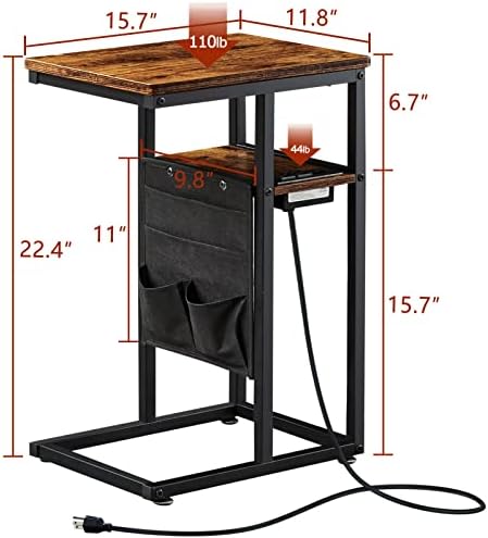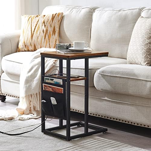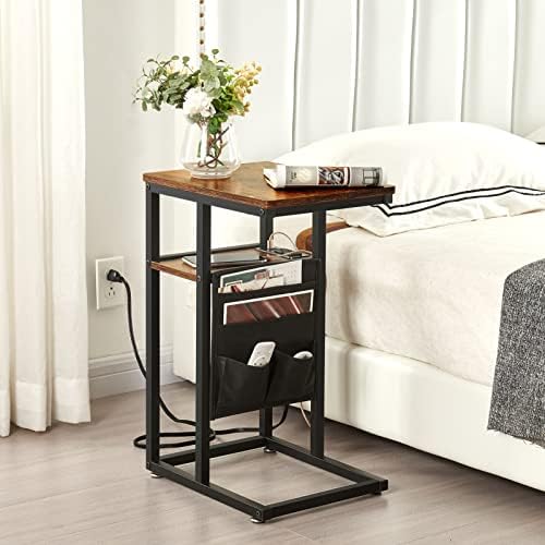 SUPERJARE C Table with Charging Station, Small Side Table C Shaped End Tablewith Fabric Bag for Small Spaces, Living Room & Bedroom, Rustic Brown
